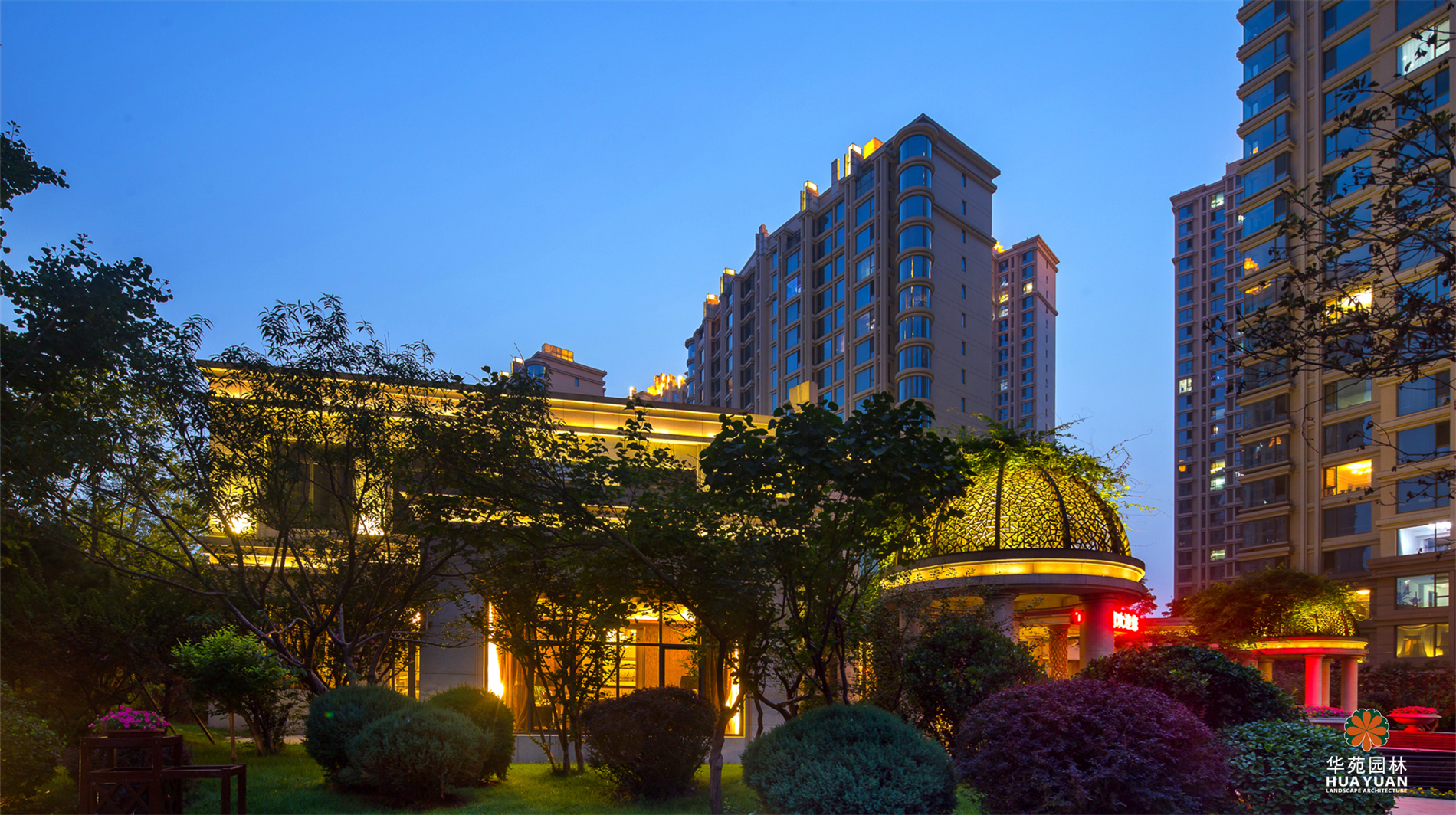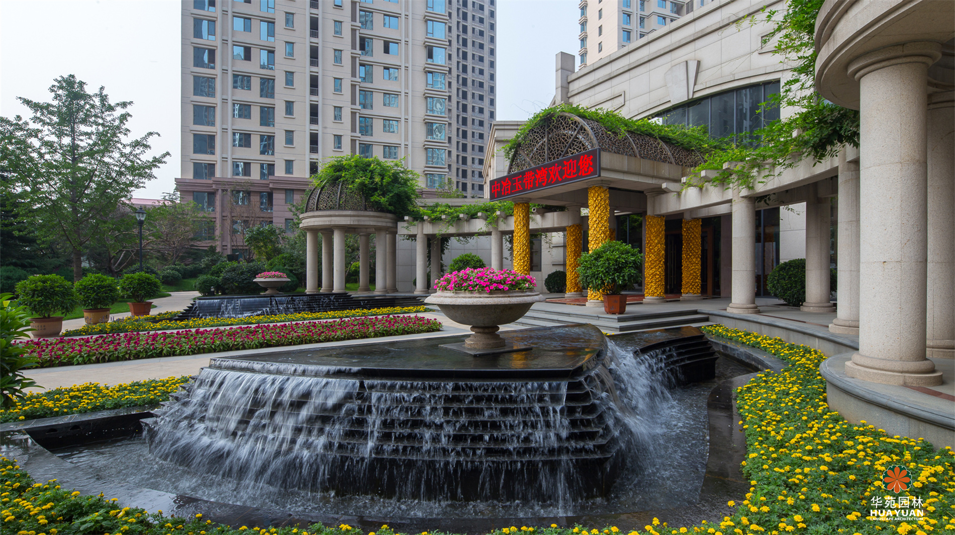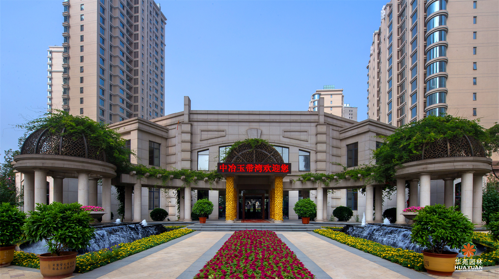 秉承新古典主義園林的設(shè)計(jì)精髓,特色水景、雕塑、高低起伏的草坪等元素與建筑風(fēng)格相互呼應(yīng),形成獨(dú)具特色的感官體驗(yàn)。尤為突出的是在中央景觀的處理上采用中西合璧的混搭手法,并在園區(qū)主景觀軸交匯處營(yíng)造出一個(gè)9萬平米的中央景觀區(qū),讓人聯(lián)想到“天圓地方、包羅萬象”的人文風(fēng)水理念,極具完美的視覺盛宴。